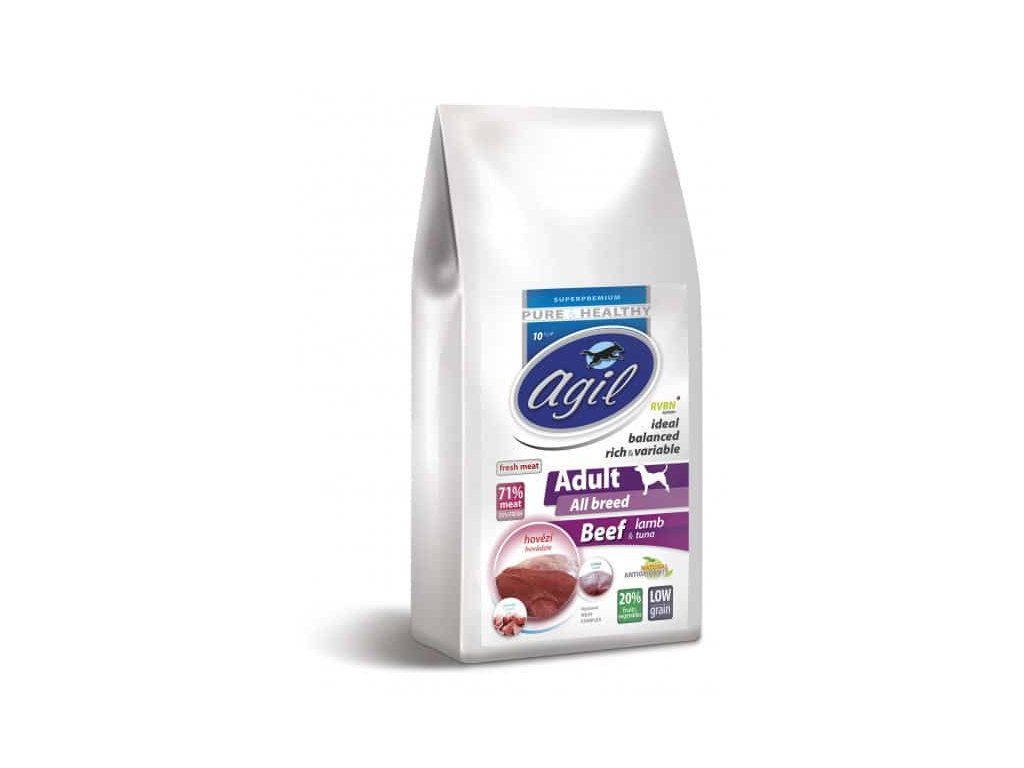 Agil Adult All Breed Low Grain Beef & Lamb & Tuna je kompletní superprémiové krmivo určené pro dospělé psy malých, středních i velkých plemen. Receptura s 54 % hovězího masa a doplněná o jehněčí a tuňák nabízí pestrý aminokyselinový profil, vysokou biologickou hodnotu a výbornou chutnost.