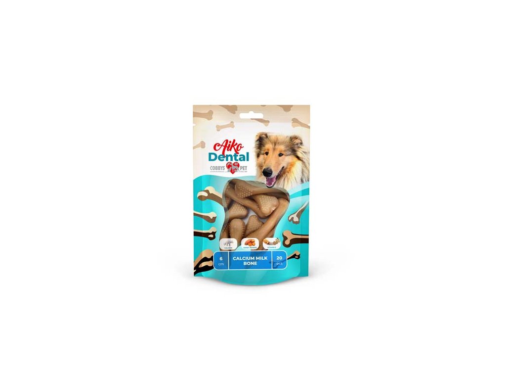 Aiko Dental Calcium Milk Bone jsou dentální kosti určené pro každodenní mechanickou podporu čištění zubů. Při žvýkání dochází k obrušování měkkého plaku z povrchu zubů a stimulaci dásní.