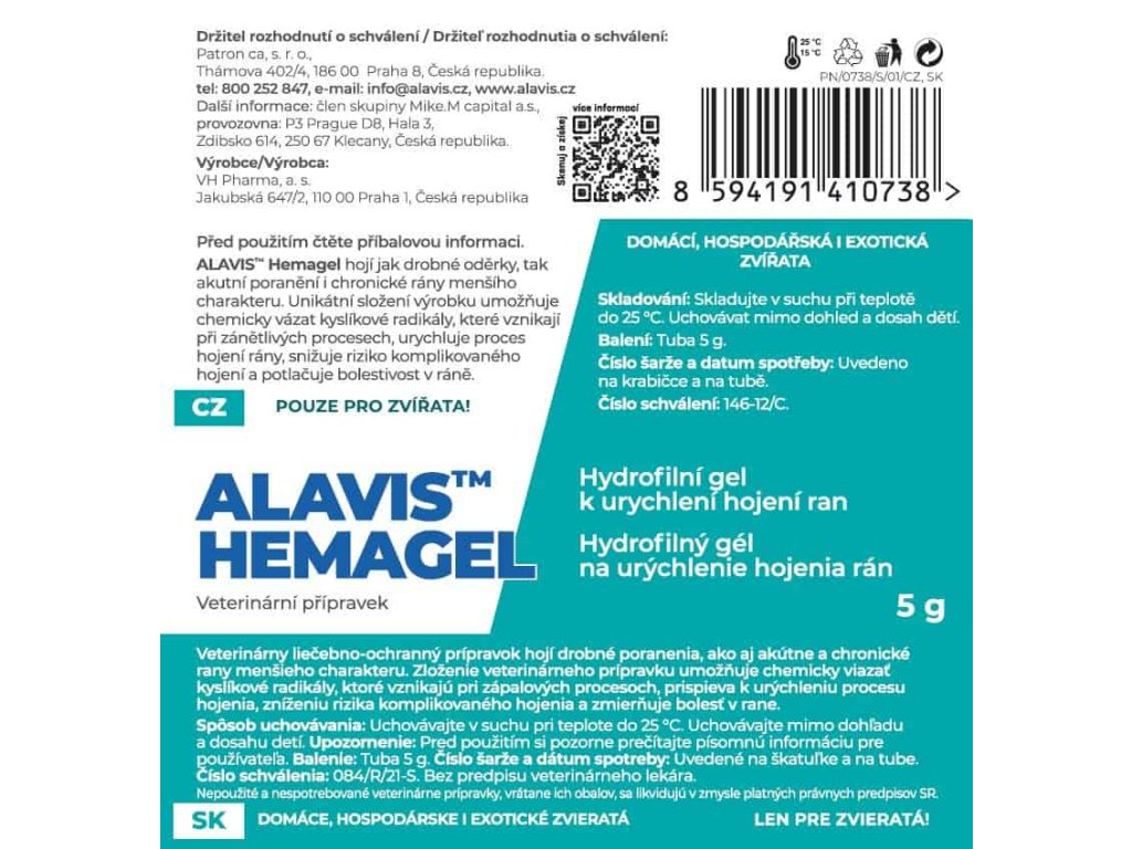 Alavis Hemagel 5 g je hydrofilní veterinární gel určený k podpoře hojení ran. Jeho unikátní struktura vytváří na ráně „druhou kůži“, která udržuje stabilní vlhkostní prostředí a chrání poraněné místo před vnějšími vlivy. Díky tomu omezuje tvorbu strupu, podporuje přirozené uzavírání rány a zkracuje dobu hojení.