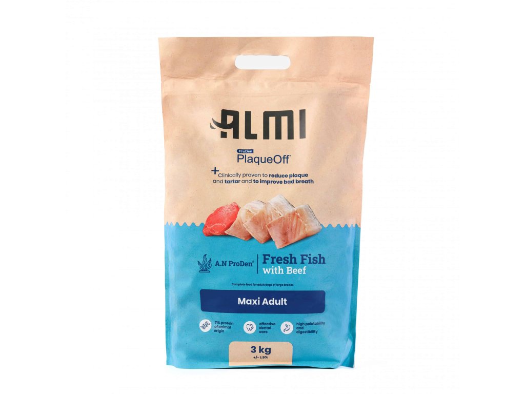Všechny receptury Almi, včetně Maxi Adult, obsahují mořskou řasu ProDen PlaqueOff, která podporuje přirozenou péči o zuby při každodenním krmení. Pravidelné podávání přispívá k omezení tvorby zubního plaku a pomáhá udržet svěží dech