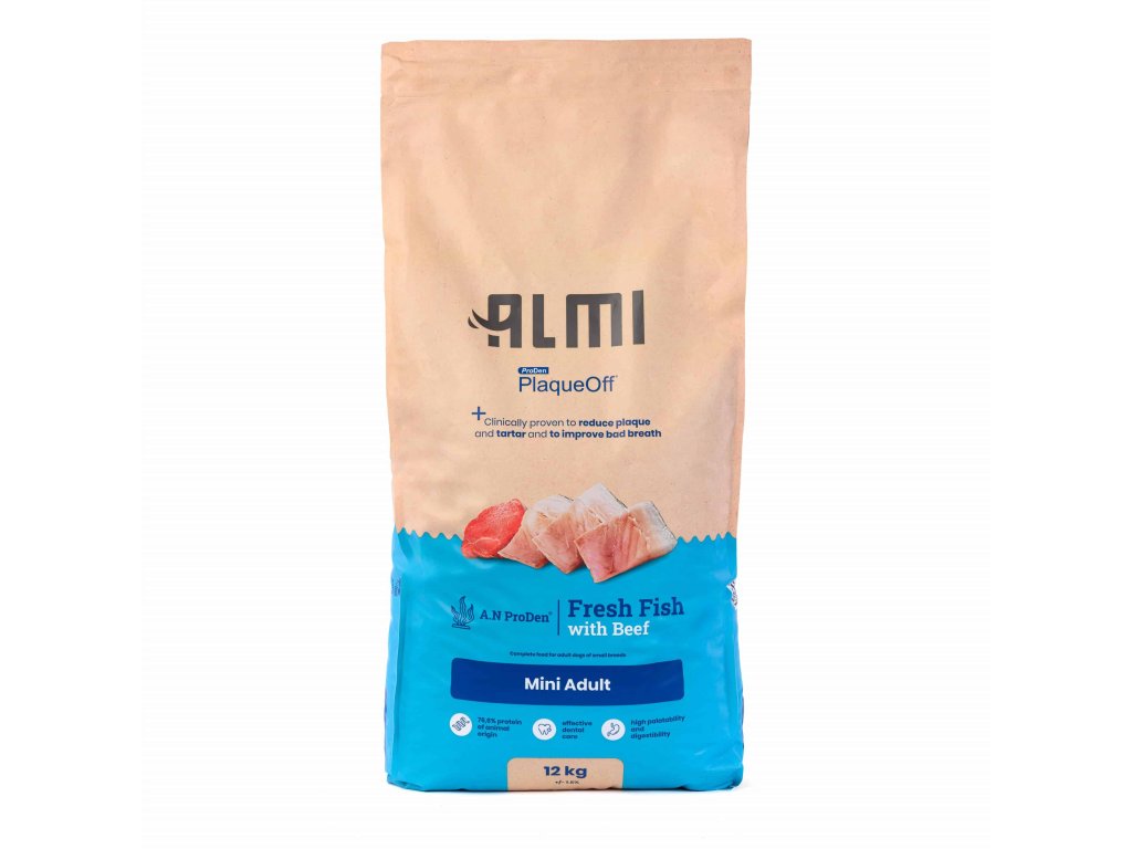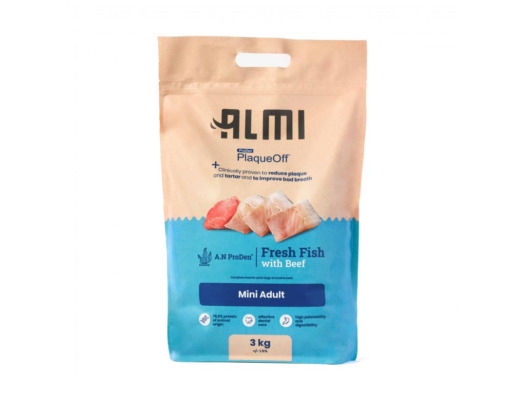 Almi Mini Adult jsou kompletní granule pro dospělé psy malých plemen. Vyvážená receptura podporuje každodenní kondici a obsahuje mořskou řasu ProDen PlaqueOff.
