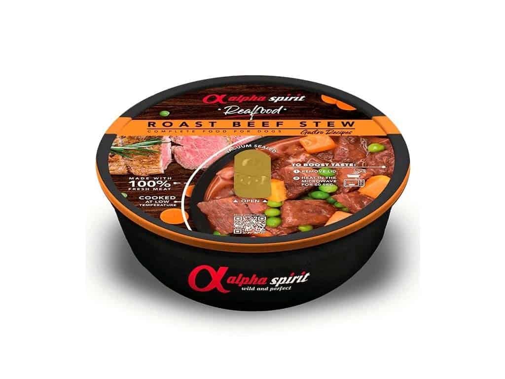 Alpha Spirit Real Food Beef 280 g je kompletní krmivo pro psy vyrobené ze 100% čerstvého hovězího masa pomalu dušeného při nízké teplotě. Jemná omáčka s hráškem, mrkví a sladkými bramborami dodává porci chuť i výživu, zatímco unikátní OPENVAC obal udržuje jídlo přirozeně čerstvé. Po ohřátí v mikrovlnce se z misky stane voňavý “domácí hrnec”, kterému odolá málokterý pes.