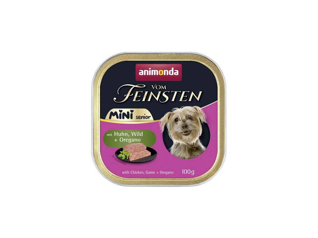 Animonda Vom Feinsten Mini Senior kuře, zvěřina a oregano 100 g – paštika pro psí seniory malých plemen