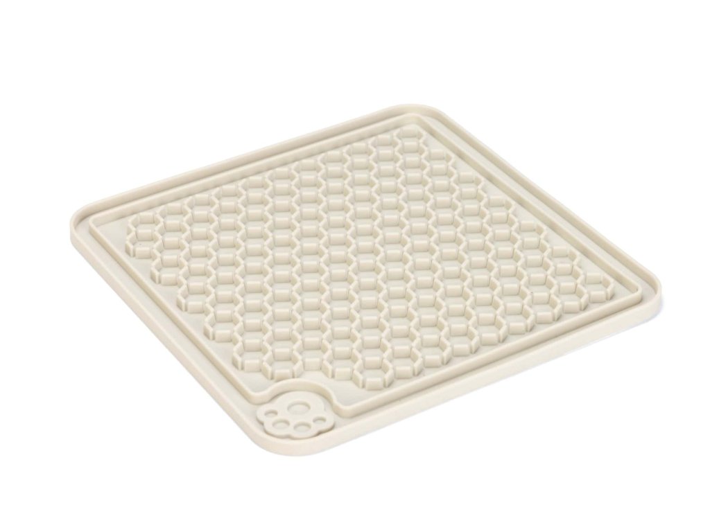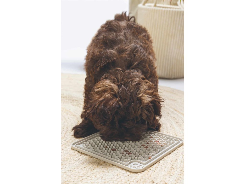 Na podložku můžeš nanést paštiku, jogurt, konzervu, masovou kapsičku nebo jiné mokré krmivo. Lízání je pro psy přirozeně uklidňující činnost, takže podložka skvěle poslouží i během stresových situací – například při bouřce, návštěvě, koupání nebo stříhání drápků.