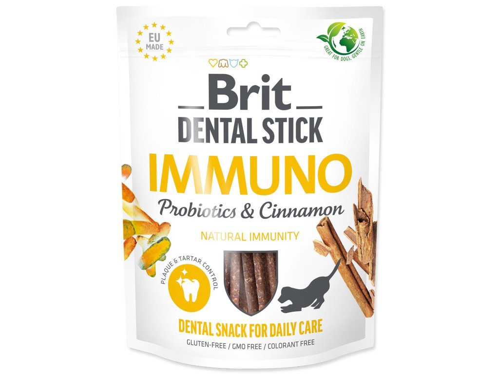 Brit Dental Stick Immuno jsou funkční dentální tyčinky pro psy, které spojují mechanickou podporu čištění zubů s aktivními složkami pro podporu přirozené imunity. Jsou vhodné jako každodenní součást péče o dutinu ústní.