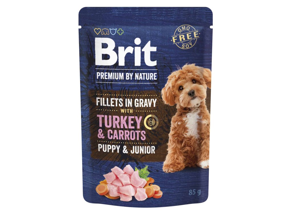 Brit Premium by Nature Puppy & Junior Fillets in Gravy s krůtou a mrkví jsou masové filetky v omáčce pro štěňata a mladé psy všech plemen, které podporují zdravý růst, trávení a hydrataci.