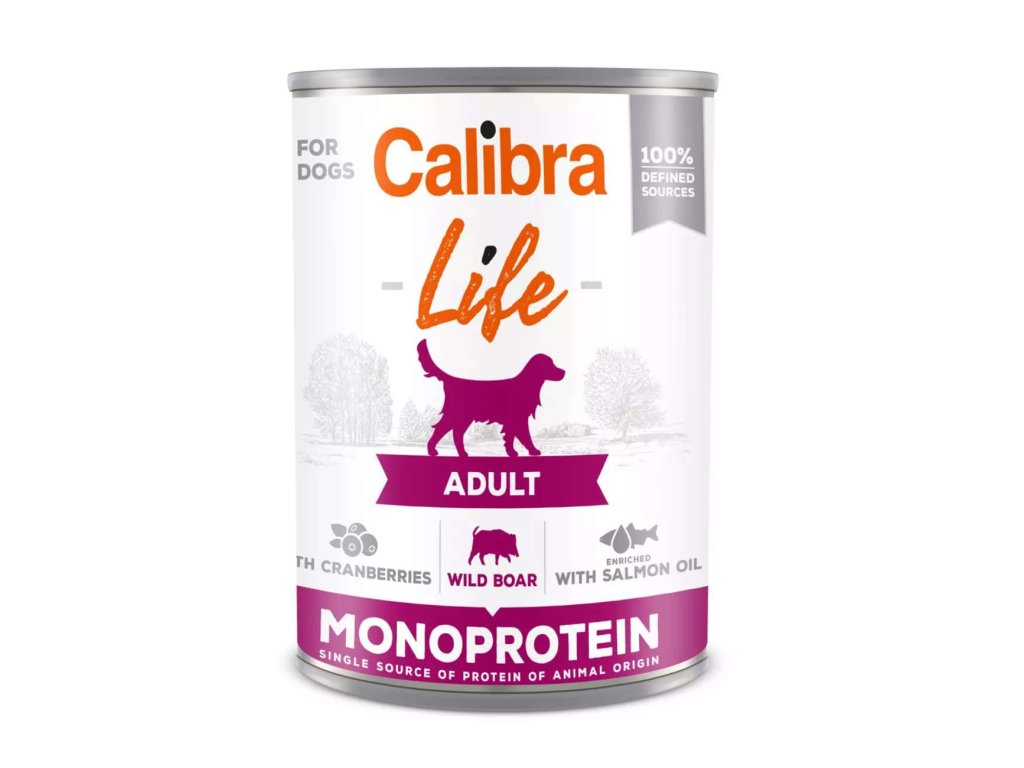 Calibra Dog Life Adult Wild Boar with Cranberries 400 g je šetrné, hypoalergenní vlhké krmivo určené pro dospělé psy všech plemen. Základem receptury je 70 % kančího masa, které je jediným živočišným proteinem. Díky monoproteinovému složení je krmivo vhodné pro psy s citlivým zažíváním nebo s potravními intolerancemi.