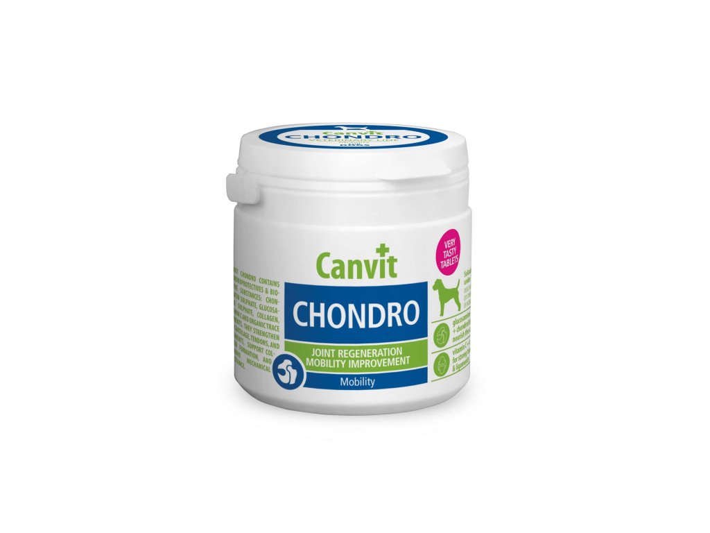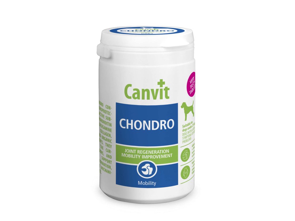 CANVIT Chondro je veterinární kloubní doplněk stravy určený k dlouhodobé podpoře kloubů, chrupavky a pojivových tkání u psů malých a středních plemen. Je vhodný pro každodenní podávání jako součást prevence a péče o pohybový aparát psů v různých životních fázích.