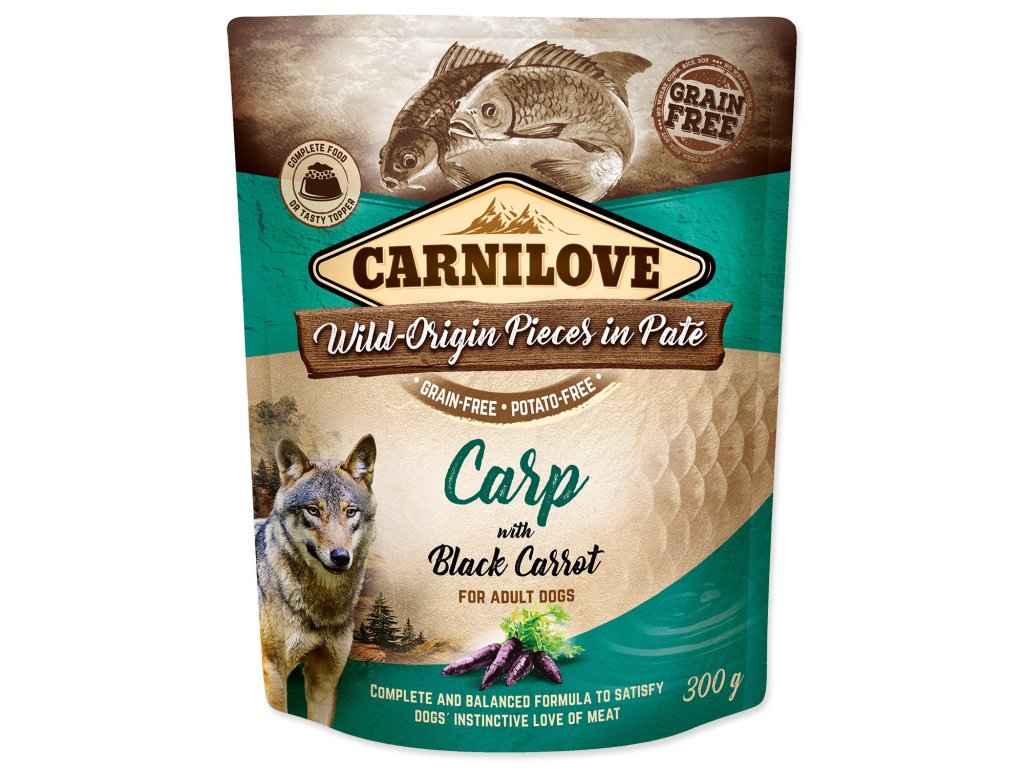 Carnilove Dog Pouch Paté Carp & Black Carrot je vysoce kvalitní, přírodní a výživné krmivo s 85 % masa a vnitřností, ideální jako kompletní krmivo nebo chutný topping ke granulím. Spojuje lehce stravitelný krocan a dietní kapří maso, které je přirozeným zdrojem omega-3 mastných kyselin. Ty podporují zdravou kůži, silné srdce a dobře fungující klouby.