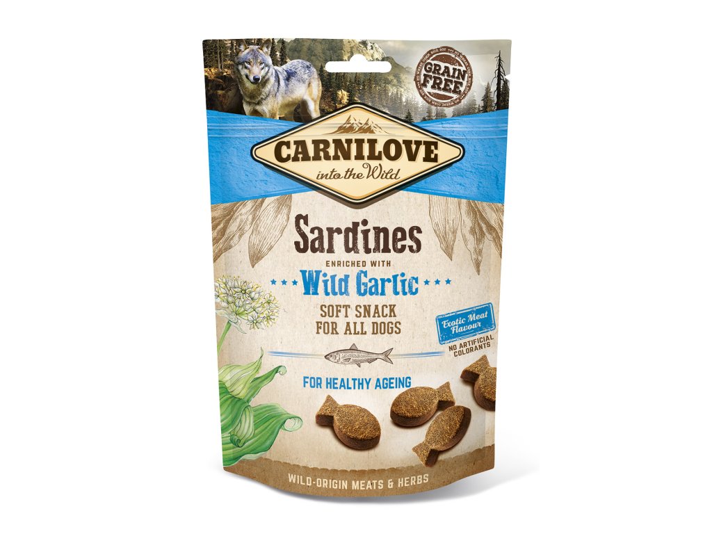 Carnilove poloměkký sardinkový pamlsek s medvědím česnekem. Pamlsek pro zdravé stárnutí, bez obsahu obilovin a brambor je vhodný pro psy všech plemen.