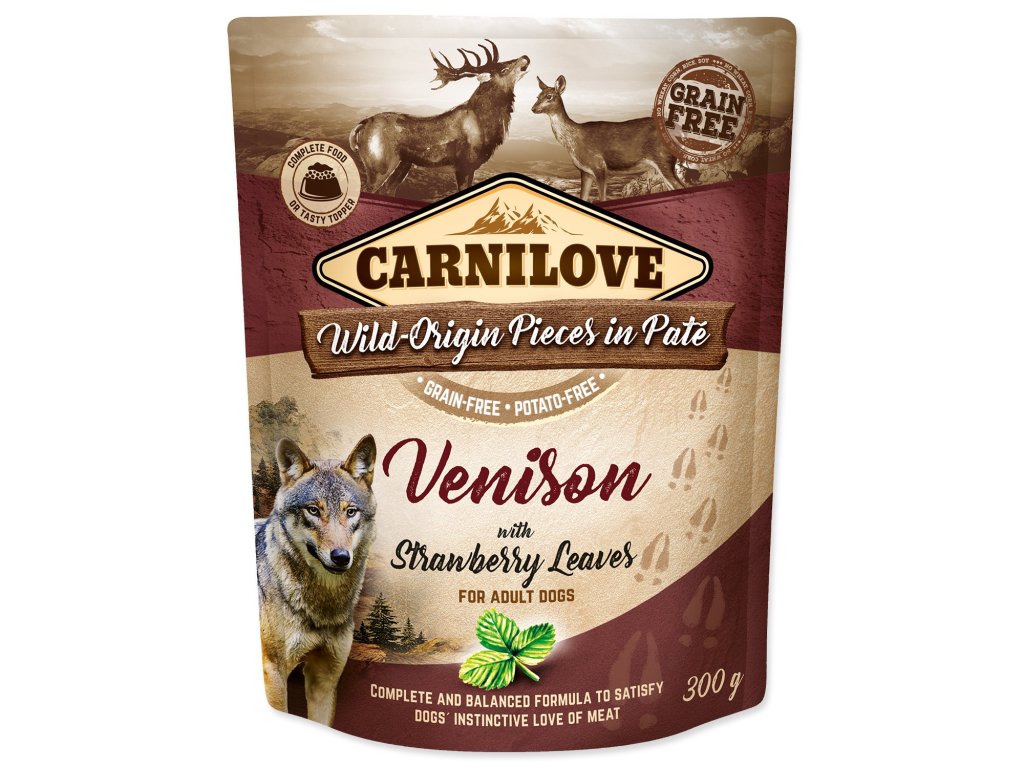 Carnilove Dog Pouch Paté Venison & Strawberry představuje vysoce kvalitní, masovou a nutričně vyváženou kapsičku s 85 % masa a vnitřností (krocan + zvěřina). Je vyráběná bez obilovin, bez brambor, bez GMO, bez sóji a bez umělých konzervantů, takže představuje ideální volbu i pro citlivé psy.