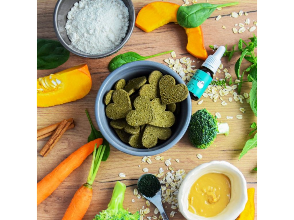 Brokolice, dýně, arašídové máslo, ovesné vločky, špenát, lněná mouka, rýžová mouka, skořice, mátový olej, spirulina, CBD (100 mg), vitamín E, benzoan sodný.