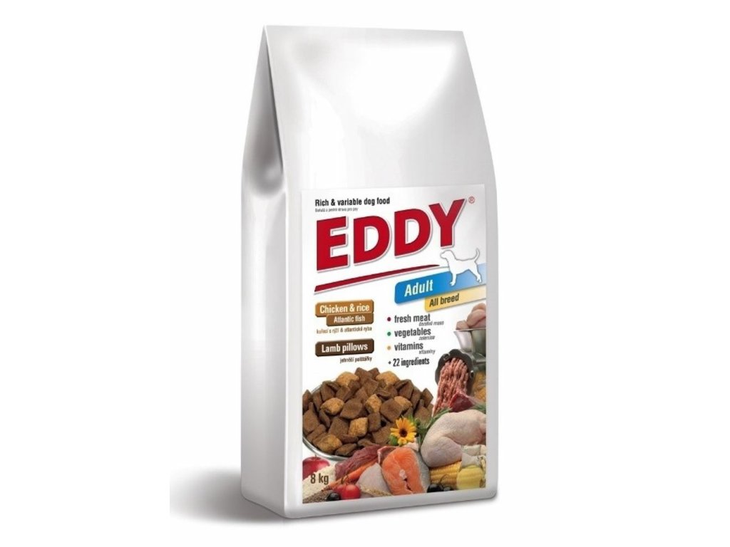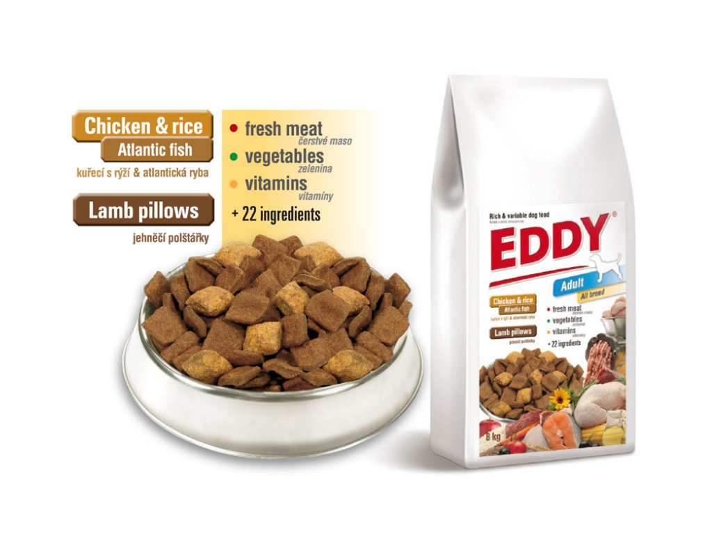 Eddy Dog Adult All Breed obsahuje masové polštářky s kuřecím masem, doplněné o rýži, zeleninu, oleje a široké spektrum vitamínů a minerálů. Lososový olej a slunečnicový olej podporují srst a kůži, zatímco glukosamin a chondroitin přispívají ke zdraví kloubů a pohybového aparátu.