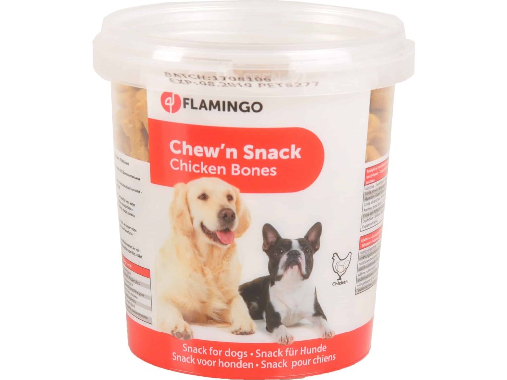 Flamingo pamlsky pro psy s kuřecím masem ve tvaru kosti 500 g jsou chutné masové pochoutky ideální jako odměna při výcviku i každodenním mlsání.