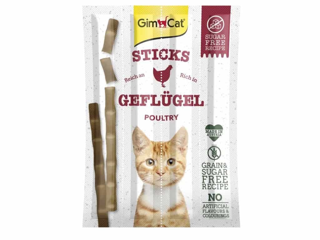 GIMCAT Sticks drůbež & játra jsou chutné masové tyčinky určené jako doplňkové krmivo nebo odměna pro kočky všech plemen. Vysoký podíl masa (90 %) zajišťuje výbornou chutnost, kterou si oblíbí i velmi náročné kočky.