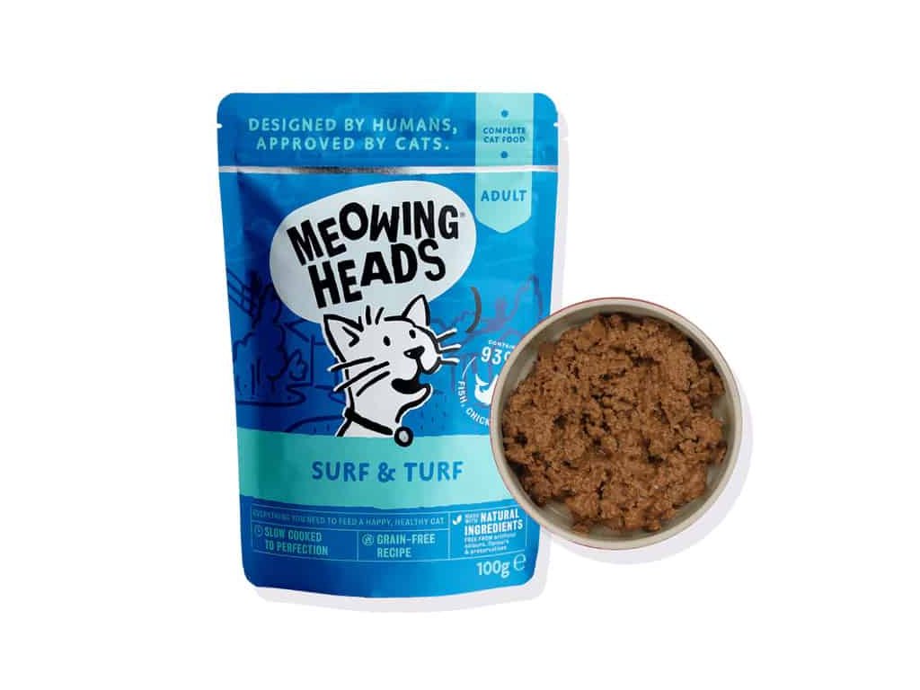 Meowing Heads kapsička pro kočky Surf & Turf obsahuje 93 % kvalitních živočišných surovin pro zdravé svaly, vitalitu a celkovou kondici kočky Kombinace ryb, kuřete a hovězího masa vytváří chutnou a výživnou recepturu, kterou si kočky velmi oblíbí.