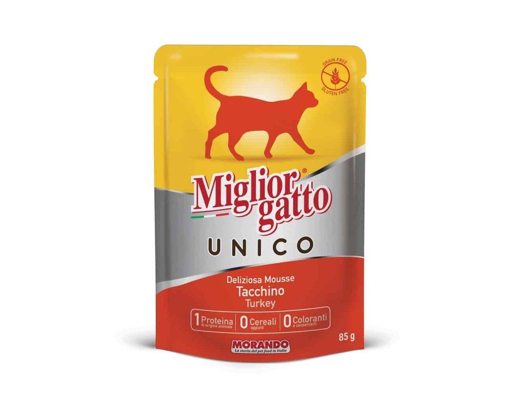 Miglior Gatto Unico krůtí obsahuje pouze krůtí maso jako jediný zdroj bílkoviny, což výrazně snižuje riziko alergických reakcí. Díky jednoduchému složení je kapsička dobře stravitelná a vhodná i pro dlouhodobé podávání.