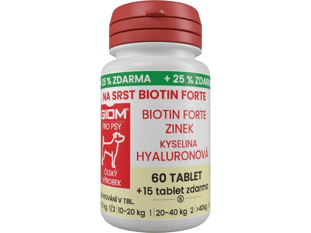 Giom S Biotin FORTE pomáhá viditelně zlepšit kvalitu srsti, podpořit její lesk a zdraví kůže – aby byl pes na první pohled zdravý a spokojený.