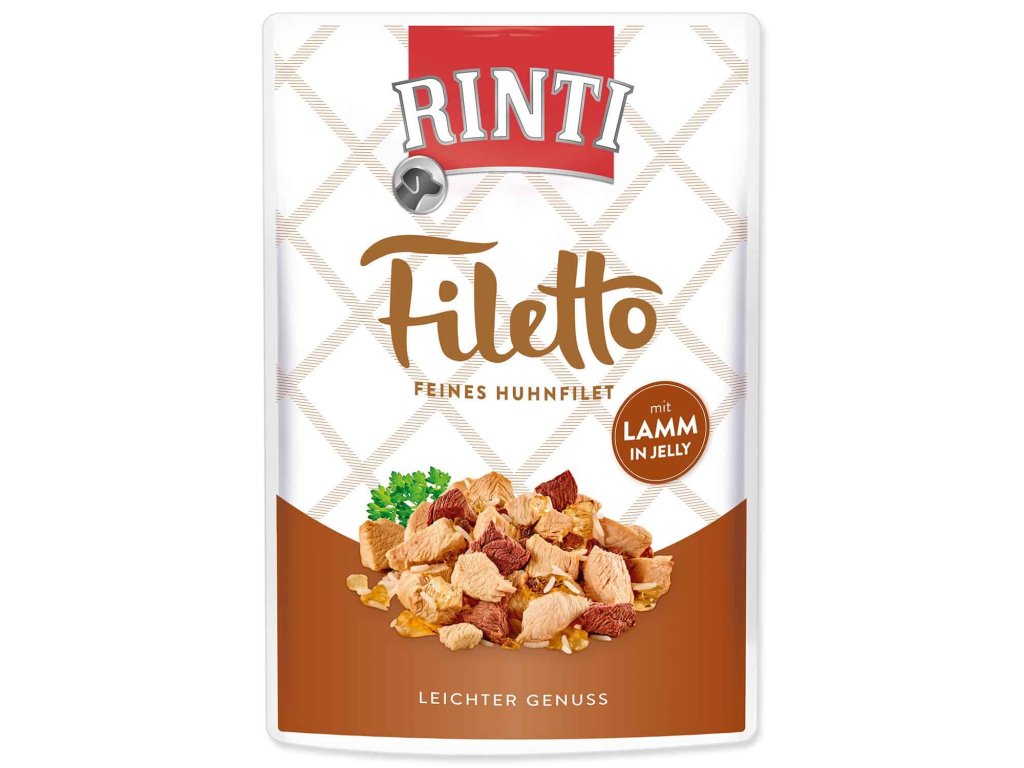 Rinti Dog Filetto kuře + jehně v želé je doplňkové vlhké krmivo, které spojuje 48 % kuřecích filetů s 9 % kvalitního jehněčího masa. Maso je připravováno při nízké teplotě, aby si udrželo maximum přirozených látek, chutí i vůní. Jemné kousky jsou obalené v měkkém želé, které podporuje chutnost a snadné podávání.