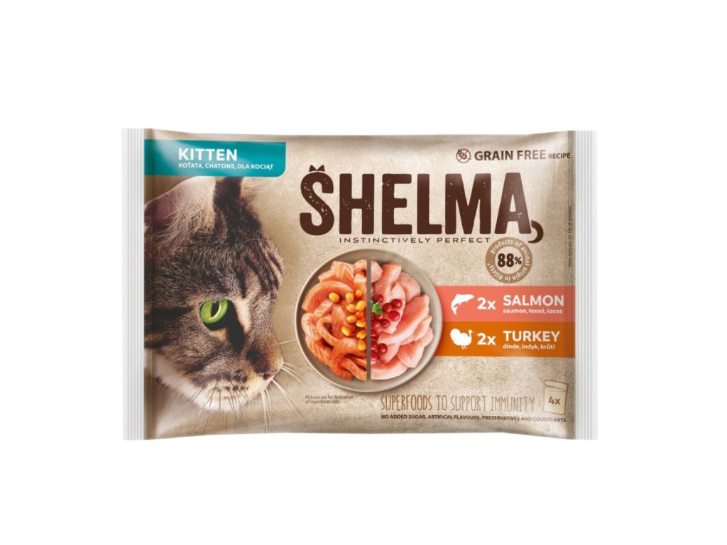 SHELMA Kitten losos & krůta v omáčce 4×85 g je superprémiové kompletní krmivo vytvořené pro optimální růst a zdraví koťat. Vysoký podíl živočišných složek ve formě šťavnatých filetek zajišťuje dostatek kvalitních bílkovin nezbytných pro vývoj svalů, kostí a imunitního systému. Kapsičky neobsahují obiloviny, což je činí dobře stravitelnými i pro nejcitlivější koťata.
