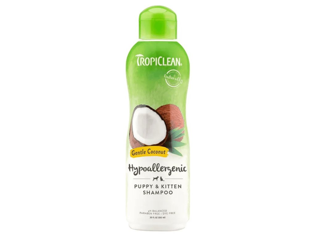 TropiClean Hypoallergenic Puppy & Kitten Coconut je prémiový přírodní šampon určený pro psy a kočky s citlivou pokožkou, alergiky a mláďata. Díky hypoalergennímu složení bez mýdla je mimořádně šetrný a vhodný i pro první koupání štěňat a koťat.