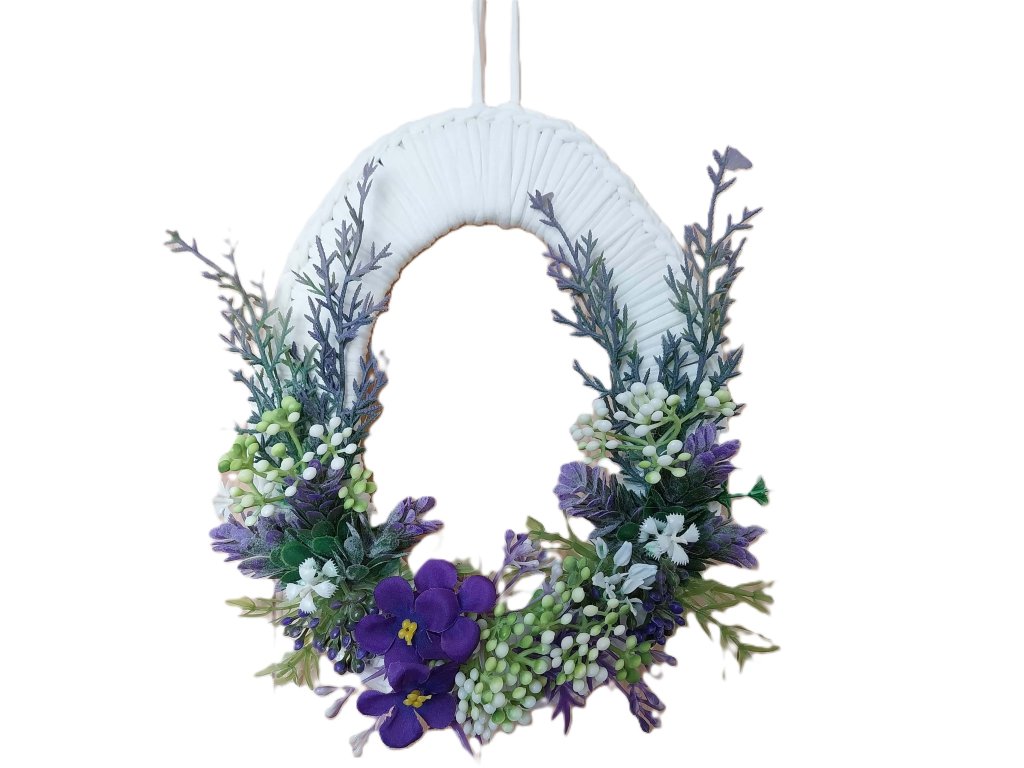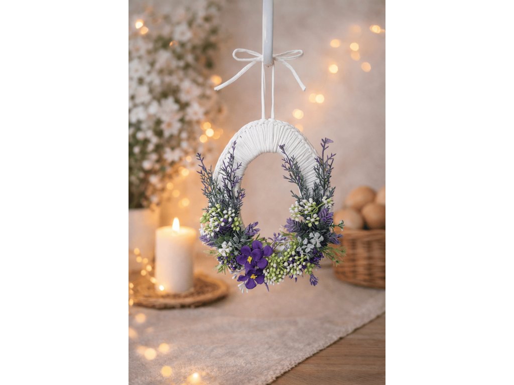 Dekorace je vhodná k zavěšení na dveře, stěnu nebo jako doplněk velikonoční výzdoby v interiéru. Díky kombinaci bílé, zelené a fialové barvy se hodí do moderního i klasického prostředí.