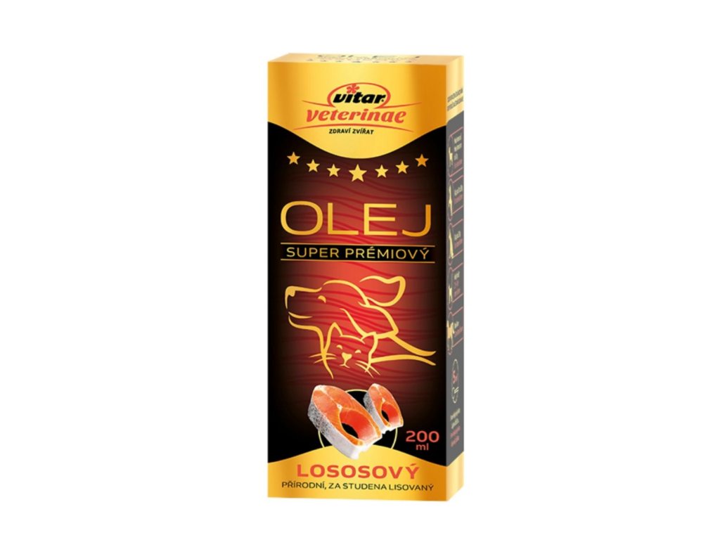 Vitar Veterinae lososový olej je doplněk stravy pro psy a kočky bohatý na omega-3 mastné kyseliny pro podporu zdravé kůže, lesklé srsti a celkové vitality.