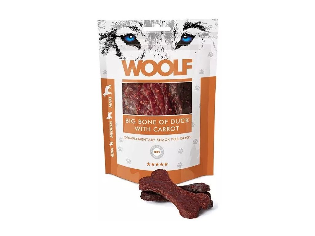 Velká kachní kost s mrkví je vhodná hlavně pro střední a větší psy. Díky svému tvaru by měla vašeho psa zabavit na delší dobu. Díky delšímu žvýkání bude pochoutka pomáhat masírovat dásně vašeho psa a přispívat k dentální hygieně. Pochoutky Woolfsnacks jsou speciálně navrženy pro psy všech plemen. Při výrobě jsou ze 100% použity bílkoviny té nejvyšší kvality pro co nejlepší příjem potravy. Veškeré pochoutky Woolfsnacks, jakmile se vyrobí, jsou zabaleny bez chemických přísad, konzervačních látek, nebo barviv. K zajištění ochrany je do sáčku umístěn absorbér kyslíku. Nekonzumovat okysličovadlo.