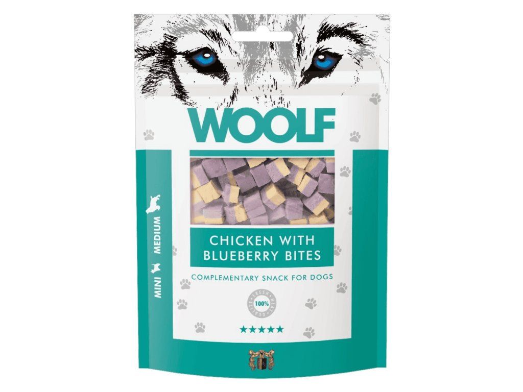 WOOLF Chicken with Blueberry Bites jsou prémiové pamlsky vytvořené z kvalitního kuřecího masa a borůvek, které představují jedno z nejbohatších přírodních superfoods. S 20% podílem borůvek podporují imunitu, chrání organismus před volnými radikály a dodávají pamlskům jemný ovocný tón. Receptura bez chemických konzervantů, barviv a dochucovadel je vhodná i pro psy s citlivým trávením. Kousky jsou měkké, snadno žvýkatelné a ideální pro malá plemena.