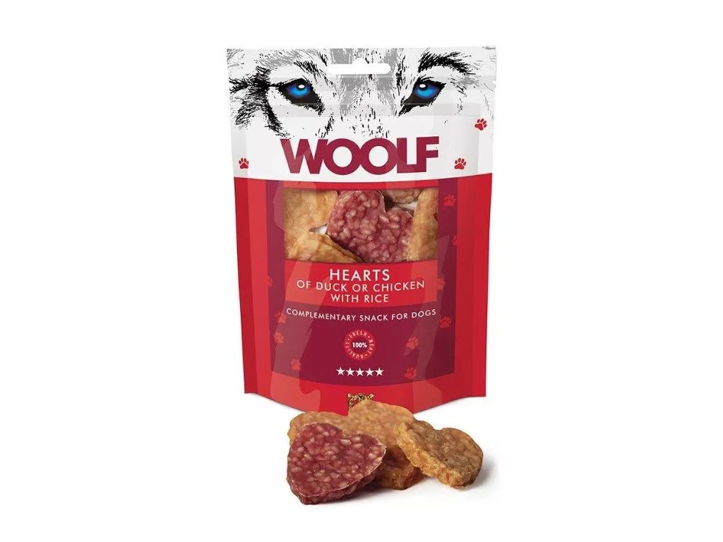 Kuřecí a kachní srdíčka s rýží jsou svým tvarem vhodná pro psy všech plemen. Pochoutka obsahuje pro zpestření dva druhy masa, které od sebe rozeznáte barvou. Při výrobě jsou ze 100% použity bílkoviny té nejvyšší kvality pro co nejlepší příjem potravy. Veškeré pochoutky Woolfsnacks, jakmile se vyrobí, jsou zabaleny bez chemických přísad, konzervačních látek, nebo barviv. K zajištění ochrany je do sáčku umístěn absorbér kyslíku. Balíček je opatřen zipem pro opětovné uzavření. Nekonzumovat okysličovadlo.
