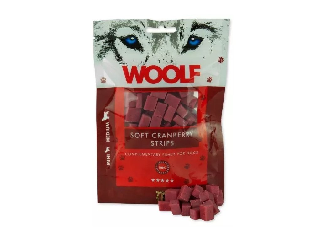 Díky 50% brusinek obsahuje pochoutka vysoké množství antioxidantů podporujících obranyschopnost. Brusinky mají částečný vliv na podporu močového aparátu. Mají částečný vliv na úpravu PH moči. Pochoutka je měkká a vhodná jak pro štěňata, dospělé, tak i staré psy. Pochoutka je vhodná hlavně pro malá a střední plemena psů. Pochoutky Woolfsnacks jsou speciálně navrženy pro psy všech plemen. Při výrobě jsou ze 100% použity bílkoviny té nejvyšší kvality pro co nejlepší příjem potravy. Veškeré pochoutky Woolfsnacks, jakmile se vyrobí, jsou zabaleny bez chemických přísad, konzervačních látek, nebo barviv. K zajištění ochrany je do sáčku umístěn absorbér kyslíku. Balíček je opatřen zipem pro opětovné uzavření. Nekonzumovat okysličovadlo.