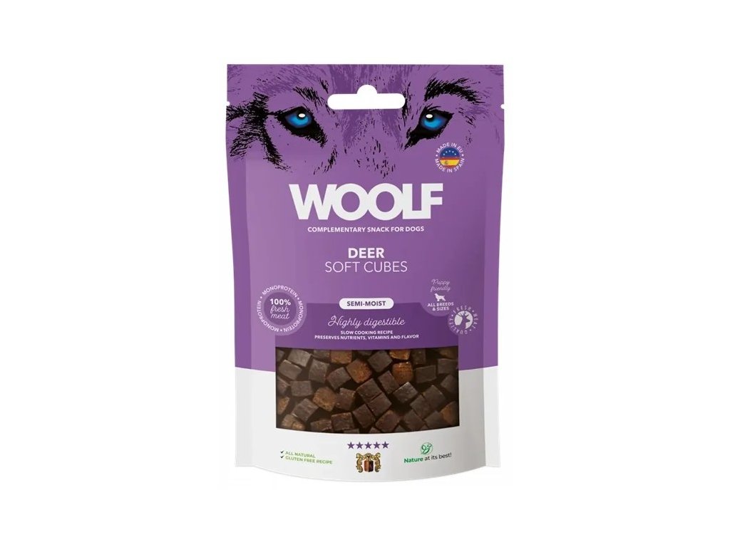 Woolf soft Cubes je pamlsek pro psy, který se může pochlubit charakteristickou polovlhkou texturou, odvozenou výhradně z přírodních ingrediencí. All-Natural: Tento termín označuje použití minimálně zpracovaných surovin bez jakýchkoli syntetických přísad, jako jsou barviva, příchutě nebo konzervační látky. Zcela přírodní pamlsky pro psy používají zdravé, rozpoznatelné složky běžně se vyskytující v přírodě, jako je pravé maso, zelenina, ovoce a obiloviny. Polovlhké: Polovlhké pamlsky pro psy slouží jako přechodná textura mezi suchými psími sušenkami a mokrým krmivem v konzervě. Jsou měkké, poddajné, lehce žvýkací a mají vyšší obsah vlhkosti než tradiční suché pamlsky, což psům usnadňuje jejich žvýkání a poskytuje chutnější zážitek.