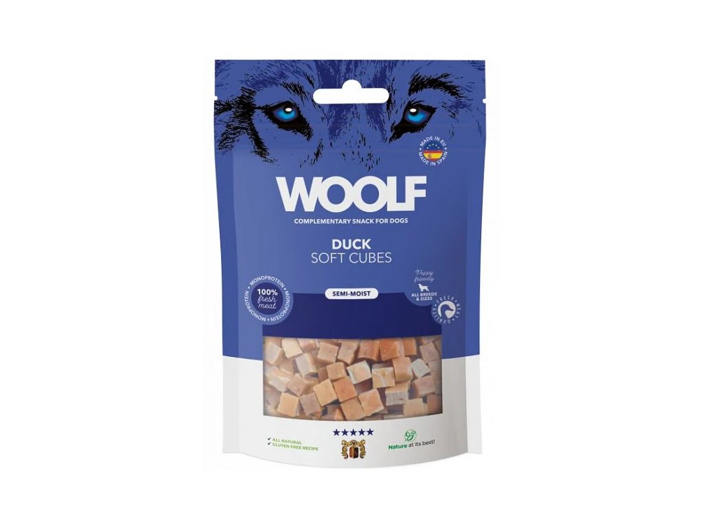Woolf soft Cubes je pamlsek pro psy, který se může pochlubit charakteristickou polovlhkou texturou, odvozenou výhradně z přírodních ingrediencí. All-Natural: Tento termín označuje použití minimálně zpracovaných surovin bez jakýchkoli syntetických přísad, jako jsou barviva, příchutě nebo konzervační látky. Zcela přírodní pamlsky pro psy používají zdravé, rozpoznatelné složky běžně se vyskytující v přírodě, jako je pravé maso, zelenina, ovoce a obiloviny. Polovlhké: Polovlhké pamlsky pro psy slouží jako přechodná textura mezi suchými psími sušenkami a mokrým krmivem v konzervě. Jsou měkké, poddajné, lehce žvýkací a mají vyšší obsah vlhkosti než tradiční suché pamlsky, což psům usnadňuje jejich žvýkání a poskytuje chutnější zážitek.