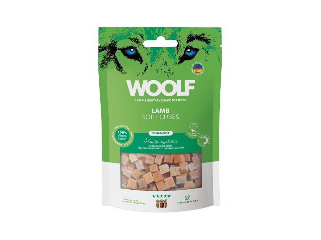 Woolf soft Cubes je pamlsek pro psy, který se může pochlubit charakteristickou polovlhkou texturou, odvozenou výhradně z přírodních ingrediencí. All-Natural: Tento termín označuje použití minimálně zpracovaných surovin bez jakýchkoli syntetických přísad, jako jsou barviva, příchutě nebo konzervační látky. Zcela přírodní pamlsky pro psy používají zdravé, rozpoznatelné složky běžně se vyskytující v přírodě, jako je pravé maso, zelenina, ovoce a obiloviny. Polovlhké: Polovlhké pamlsky pro psy slouží jako přechodná textura mezi suchými psími sušenkami a mokrým krmivem v konzervě. Jsou měkké, poddajné, lehce žvýkací a mají vyšší obsah vlhkosti než tradiční suché pamlsky, což psům usnadňuje jejich žvýkání a poskytuje chutnější zážitek.