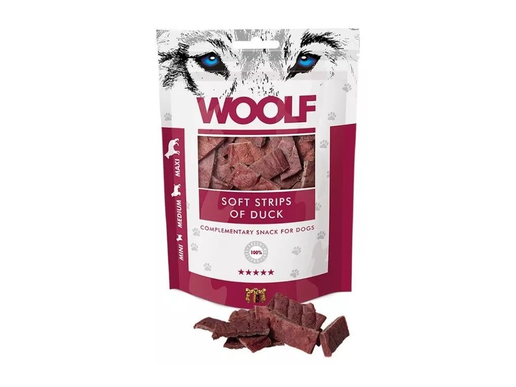 Měkké pochoutky z kachního masa s upravenou velikostí tak, aby vyhovovala jak malým, tak větším plemenům psů. Pochoutka je měkká a vhodná pro štěňata a starší psy. Pochoutky Woolfsnacks jsou speciálně navrženy pro psy všech plemen. Při výrobě jsou ze 100% použity bílkoviny té nejvyšší kvality pro co nejlepší příjem potravy. Veškeré pochoutky Woolfsnacks, jakmile se vyrobí, jsou zabaleny bez chemických přísad, konzervačních látek, nebo barviv. K zajištění ochrany je do sáčku umístěn absorbér kyslíku.